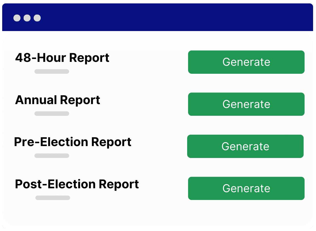 Drafting your FEC or state-required campaign finance disclosure reports is easy with Campaign Deputy. Quickly generate the reports you need, always prepared for worry-free submission.
